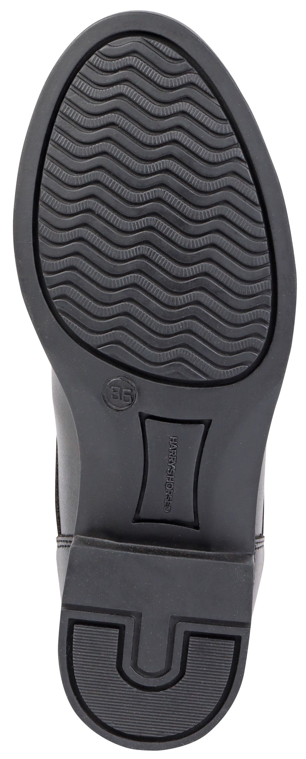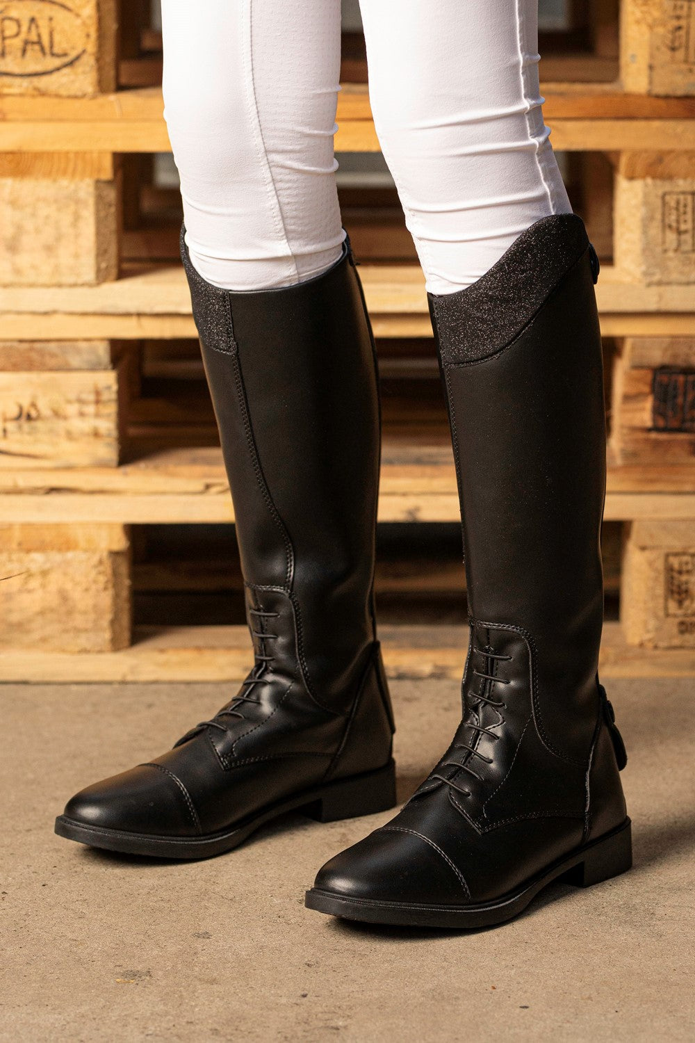 Synthetische leren rijlaars met ritssluiting aan de achterzijde. De rits is boven en onder afgedekt met een flapje met een drukknoopsluiting. Aan de voorkant een elastische veter, een elastische inzet op de kuit voor een optimale aansluiting en een glitter versiering naast de knie.