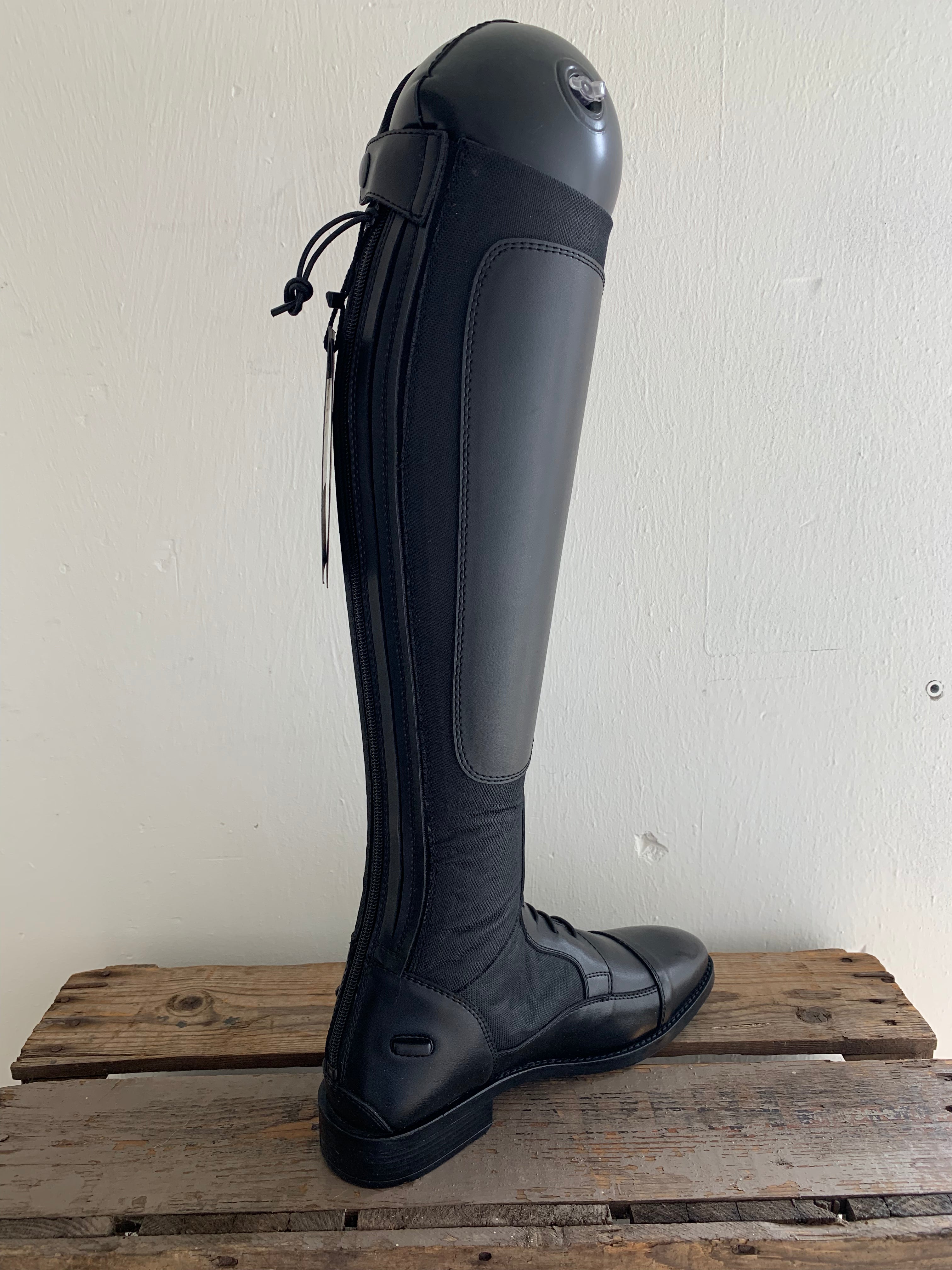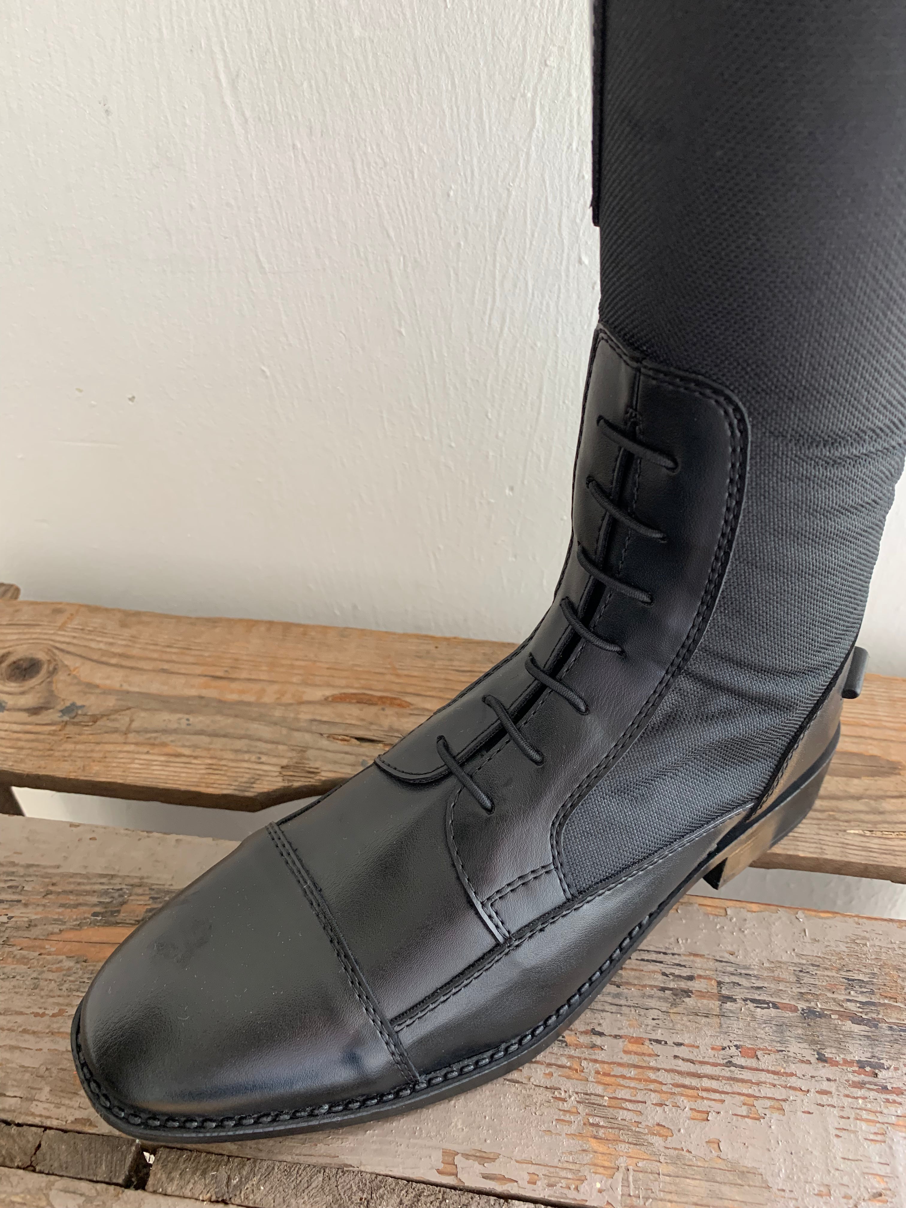 Prachtige zwarte leren rijlaarzen met elastische synthetische zijkant veter aan de voorkant en rits aan de achterkant.