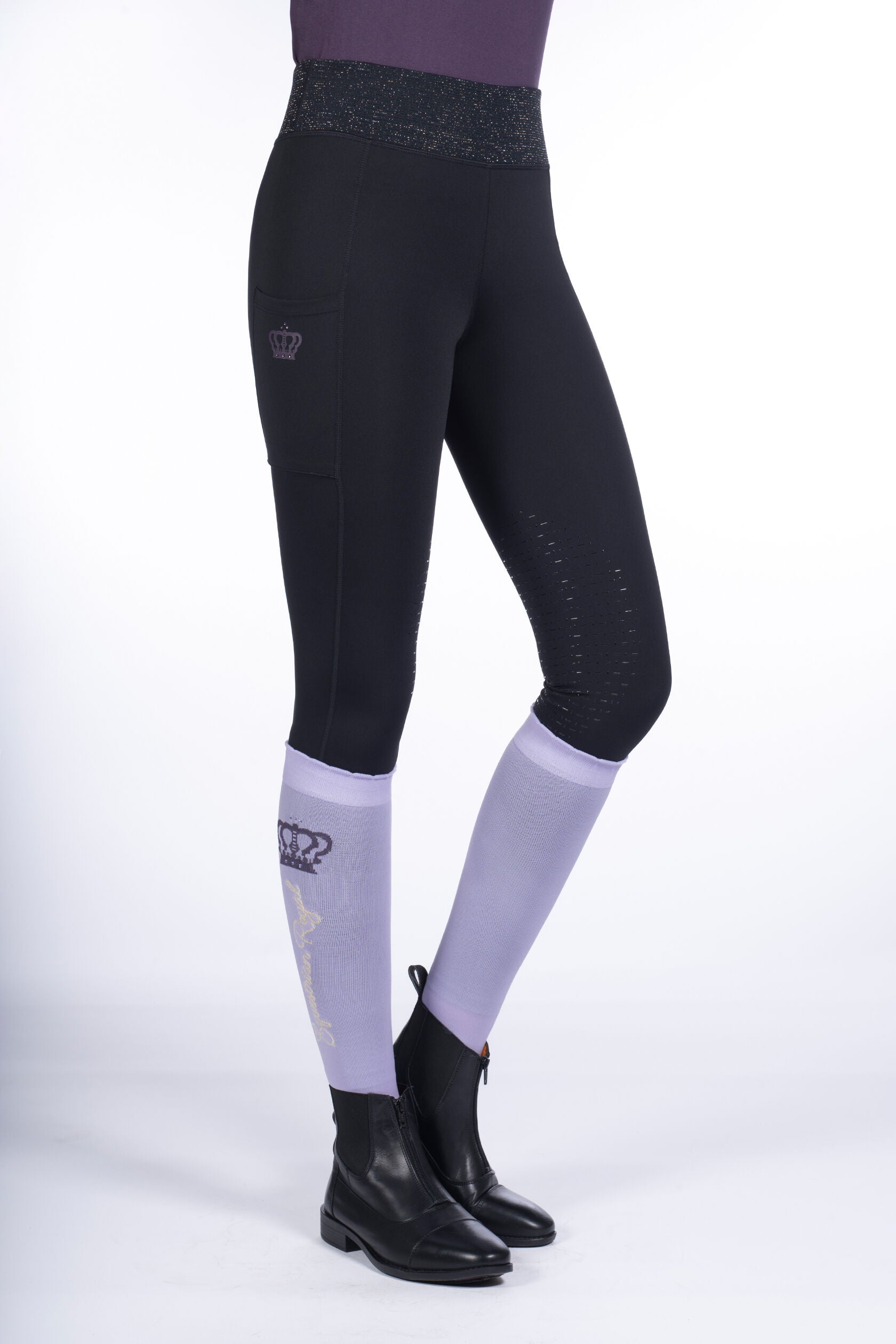 Zeer comfortabele Rijlegging uit de Equestrian Royal collectie van HKM. Gemaakt van hoogwaardige, goed ademende, bi-elastische stretchstof. Voorzien van een hoge tailleband met aan de achterzijde een zakje met rits, siliconen op de knie en een handige zak voor je mobiele telefoon. Afgewerkt met een Equestrian Royal logo met glinsterende crystals. Materiaal: 69% nylon, 32% elasthan. Maschinewasbaar op 30 graden C.