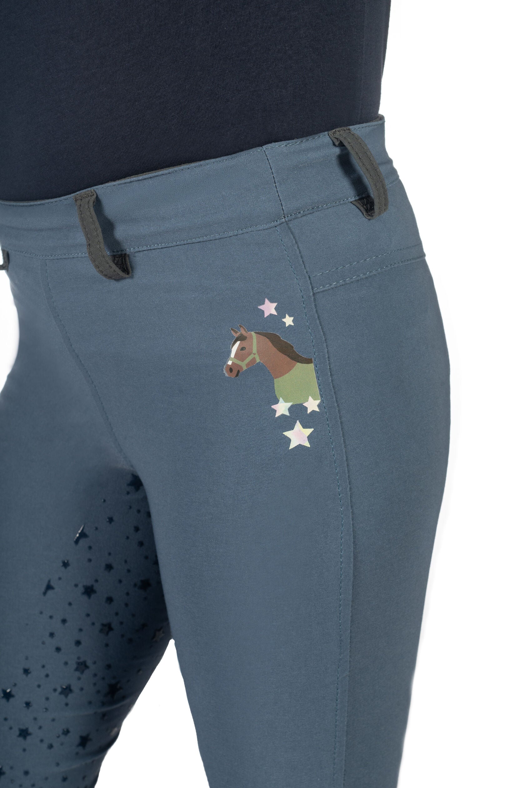 De Pony Dream II rijlegging voor kinderen combineert een schattig design met maximaal draagcomfort. De silicone full seat zorgt voor optimale grip in het zadel, terwijl de ademende mesh inzetstukken bij de pijpuiteinden extra comfort bieden. Dankzij de in grootte verstelbare, elastische tailleband sluit de legging perfect aan en groeit deze mee met de jonge ruiter. De lieve paardenprint en speelse sterrenmotieven maken van deze rijlegging een absolute favoriet. Praktische riemlussen maken het mogelijk om de legging naar wens te stylen.