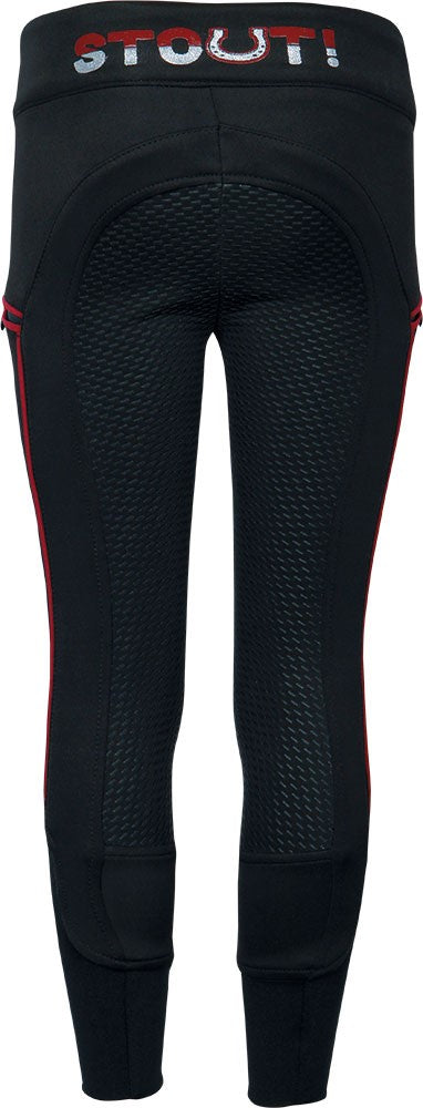 Hippe paardrijlegging. Zeer comfortabele en stretchy stof, pull-up model met STOUT! logo, contrast pipings, rondgenaaid zitvlak met siliconen voor extra grip in het zadel, flexlegs voor extra comfort in de rijlaarzen