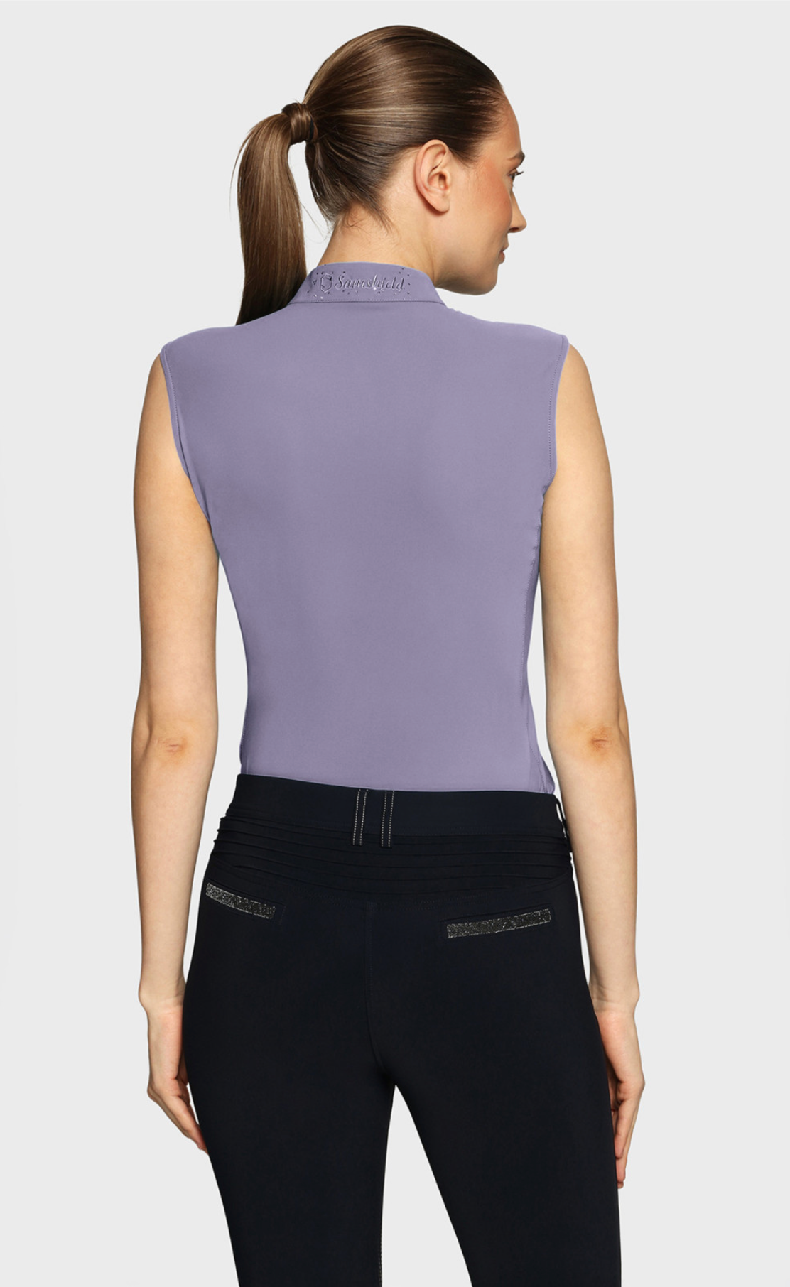Gemaakt van een technisch Italiaans materiaal, garandeert het ademend vermogen, snelle droging, elasticiteit, langdurig comfort en duurzaamheid, zodat je elke beweging moeiteloos kunt uitvoeren. Het Samshield Swarovski-kristal op de borst en het ton-sur-ton geborduurde logo met kristallen versiering op de achterkant van de kraag voegen een verfijnde touch toe, terwijl de ton-sur-ton onzichtbare halve rits garant staat voor praktisch gebruiksgemak en discrete elegantie. Licht, technisch en verfijnd: de Bella Sleeveless wordt de onmisbare partner voor veeleisende ruiters.