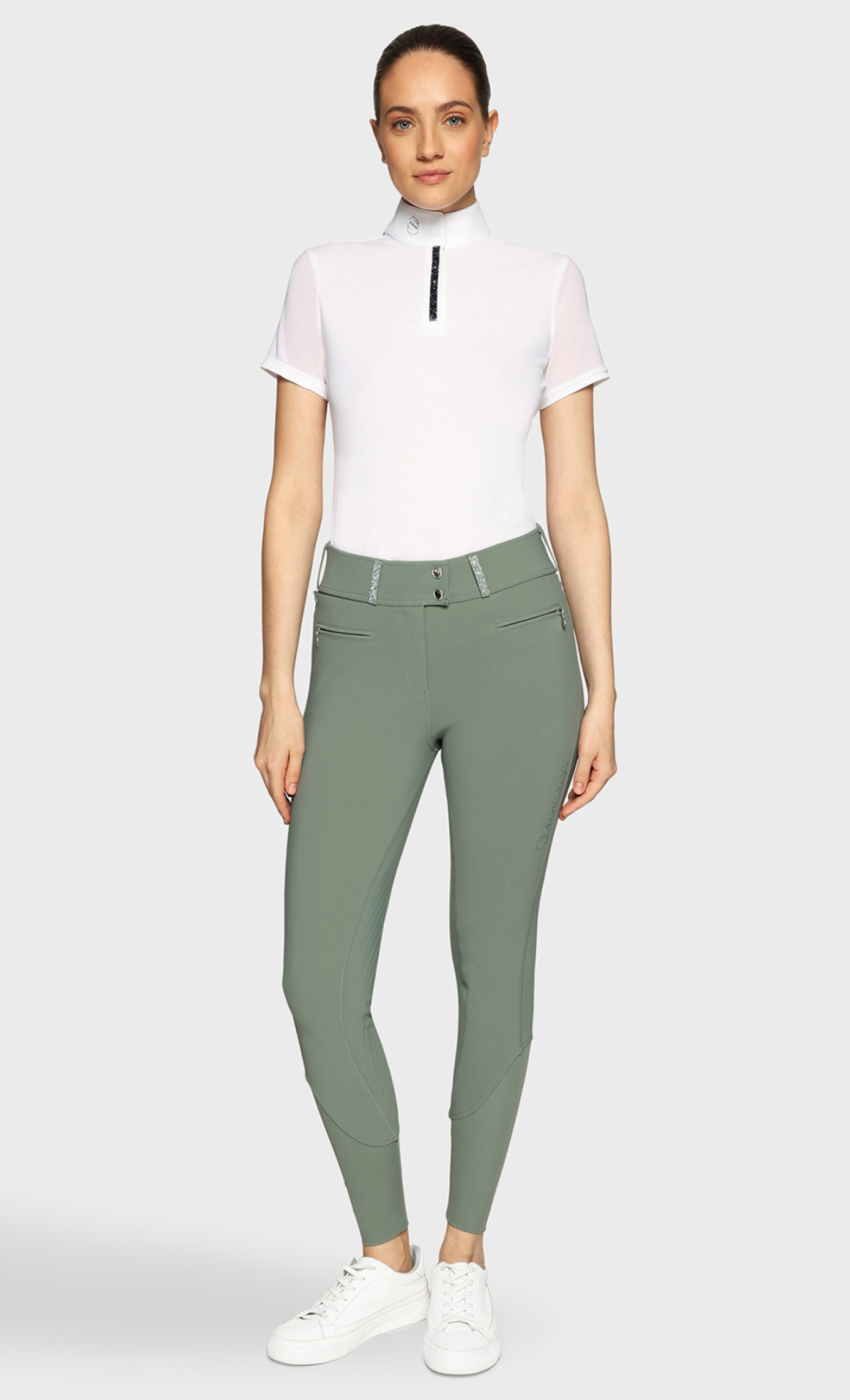 Gemaakt van ademende, elastische en duurzame Italiaanse stof, garandeert de broek comfort en duurzaamheid, zelfs tijdens de meest veeleisende sessies. Details van Swarovski-kristalstof op de riemlussen en achterzakken voegen een vleugje ingetogen elegantie toe, terwijl de kenmerkende Samshield-plooi op de rug de verfijning van het ontwerp benadrukt. Compressiestof bij de enkels optimaliseert de bloedsomloop en zakken met rits, waaronder een onzichtbaar telefoonvakje, combineren functionaliteit met prestaties.