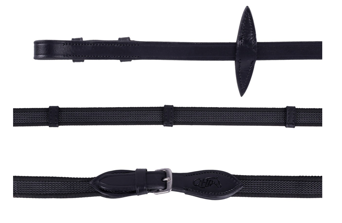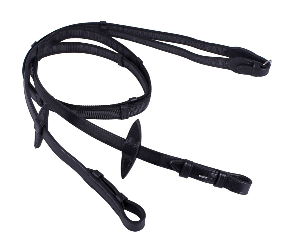 Deze teugels zijn over de hele lengte doorweven met rubber voor een goede grip. Afgewerkt met leren stops en voorzien van martingaalstoppers.