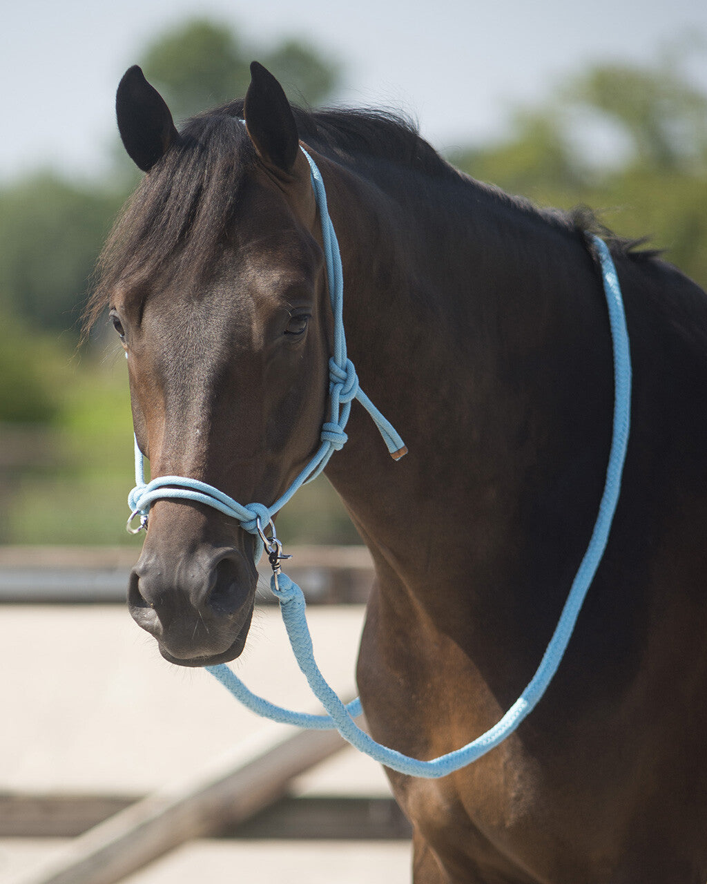 Touwhalsters zijn zeer veelzijdig, gebruik ze bijvoorbeeld voor grondwerk of om bitloos mee te rijden. Dit halster is voorzien van 2 metalen ringen en wordt geleverd met een dik koord voorzien van 2 clips om te gebruiken als teugels.