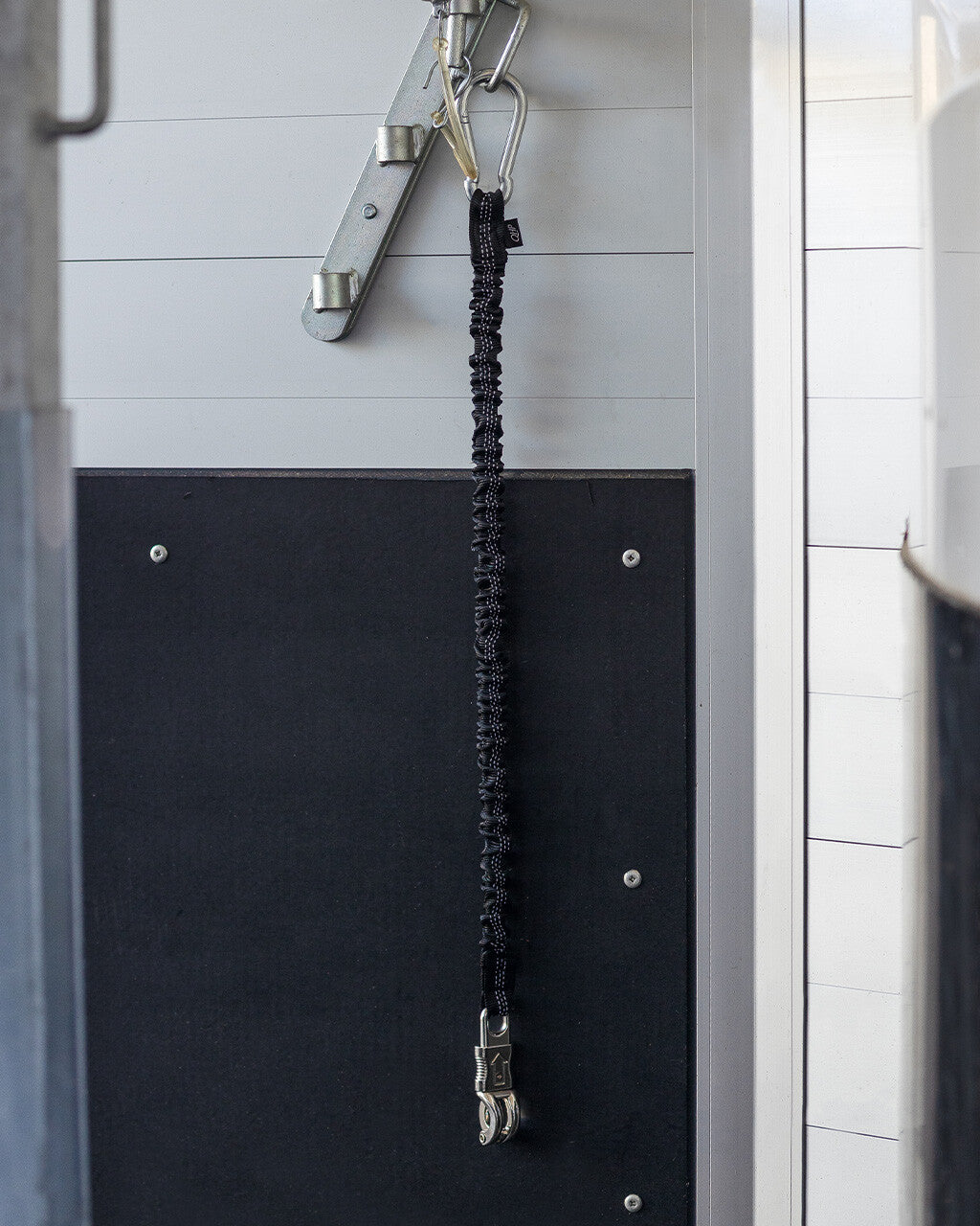 Elastisch touw dat in de trailer gebruikt kan worden om paarden snel en veilig vast te zetten. Voorzien van een karabijnhaak om aan de trailer te bevestigen en een paniekhaak die aan het halster van het paard vastgemaakt kan worden. Het touw is afgewerkt met een kunststof bekleding.