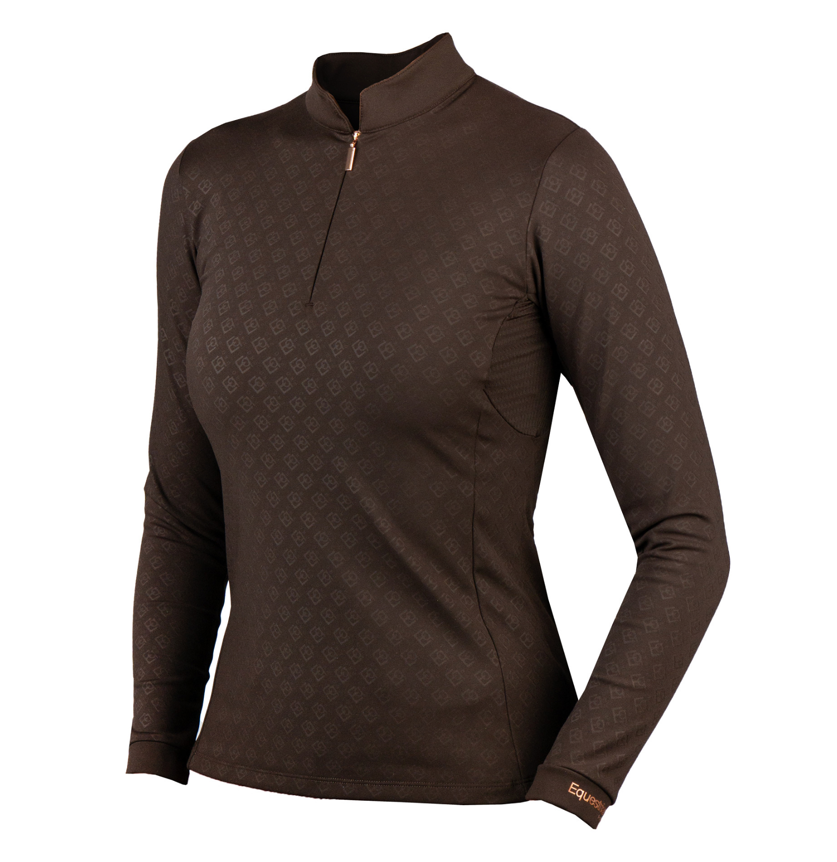 Deze stijlvolle top combineert sneldrogende, ademende stof met een geborstelde binnenkant voor extra warmte, aangevuld met meshpanelen voor ventilatie en een elegante opstaand Peter Pan-kraagje. Afgewerkt met roségouden accenten en een all-over Equestrian Pro-print, is deze top geïnspireerd op de bestseller Luxury en biedt de top de perfecte balans tussen elegantie en functionaliteit.
