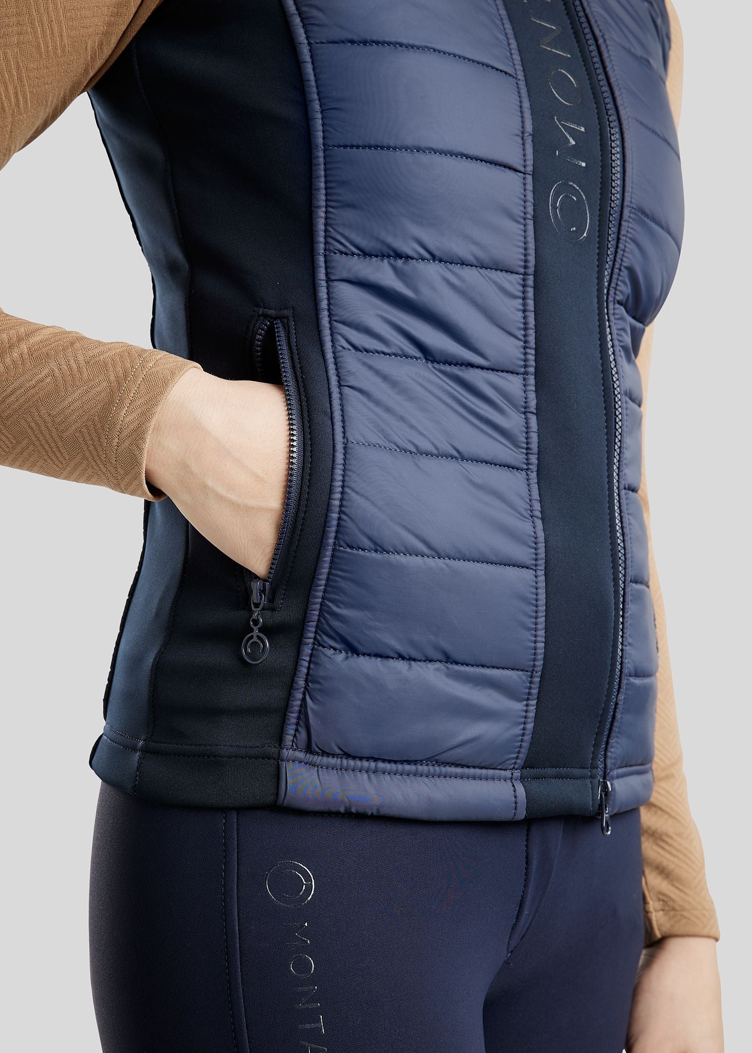 Een elegante ton-sur-ton rits en een subtiele glans geven het vest een luxe uitstraling, terwijl twee praktische zakken met rits ruimte bieden voor essentiële spullen zoals sleutels of je telefoon – een must-have voor een actieve levensstijl.