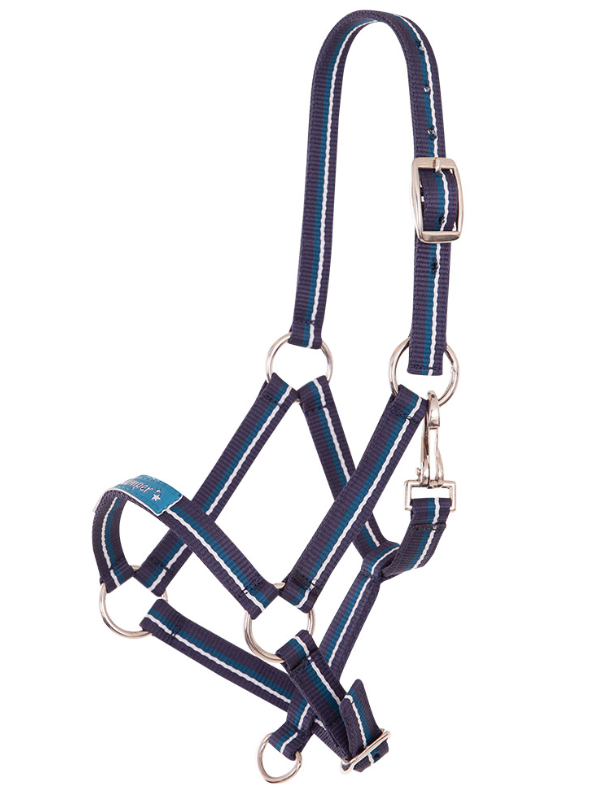 Driekleurig veulenhalster met smalle banden van gestreept polypropyleen. Zowel het kopstuk als de neusriem zijn verstelbaar met een gespsluiting. De neusriem is afgewerkt met een label met fun text. De keelriem is voorzien van een karabijnhaak. Het halster is voorzien van zinken fournituren met een zilverkleurige finish.