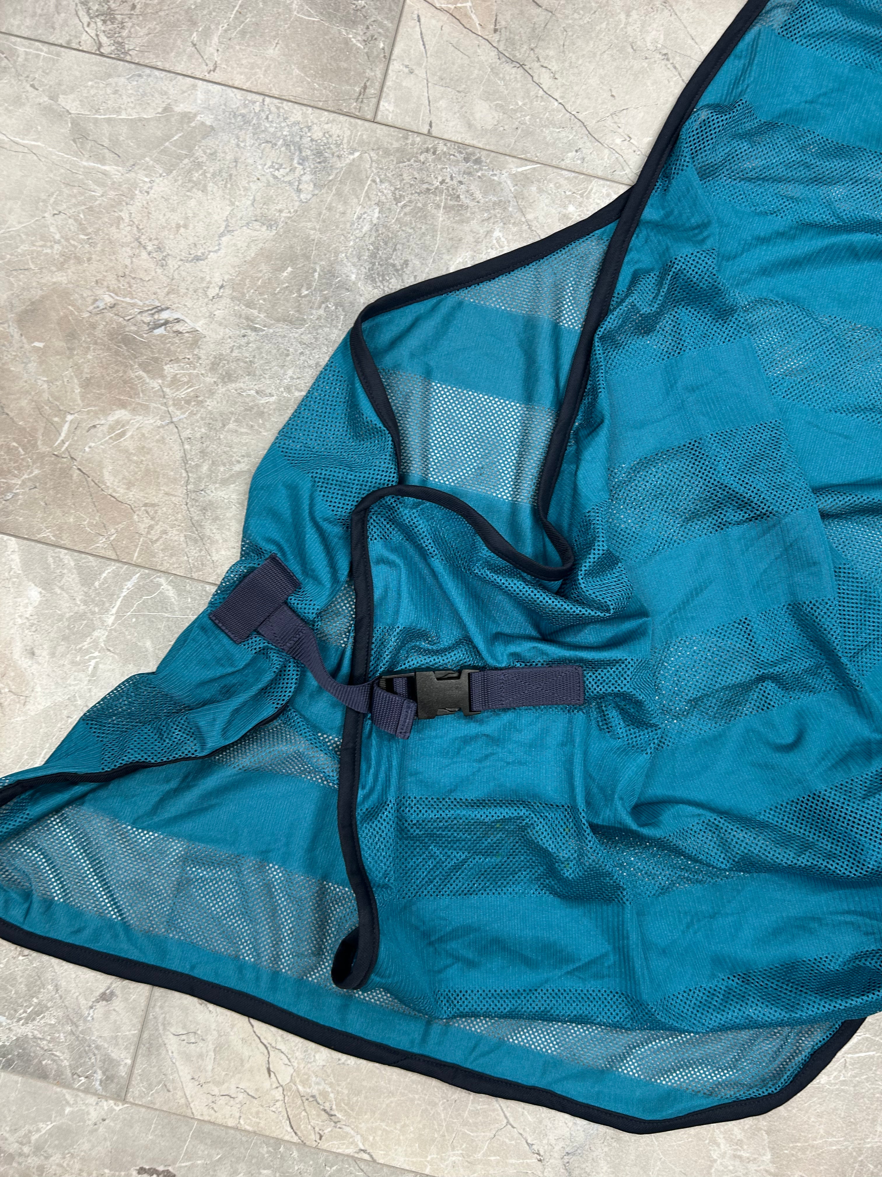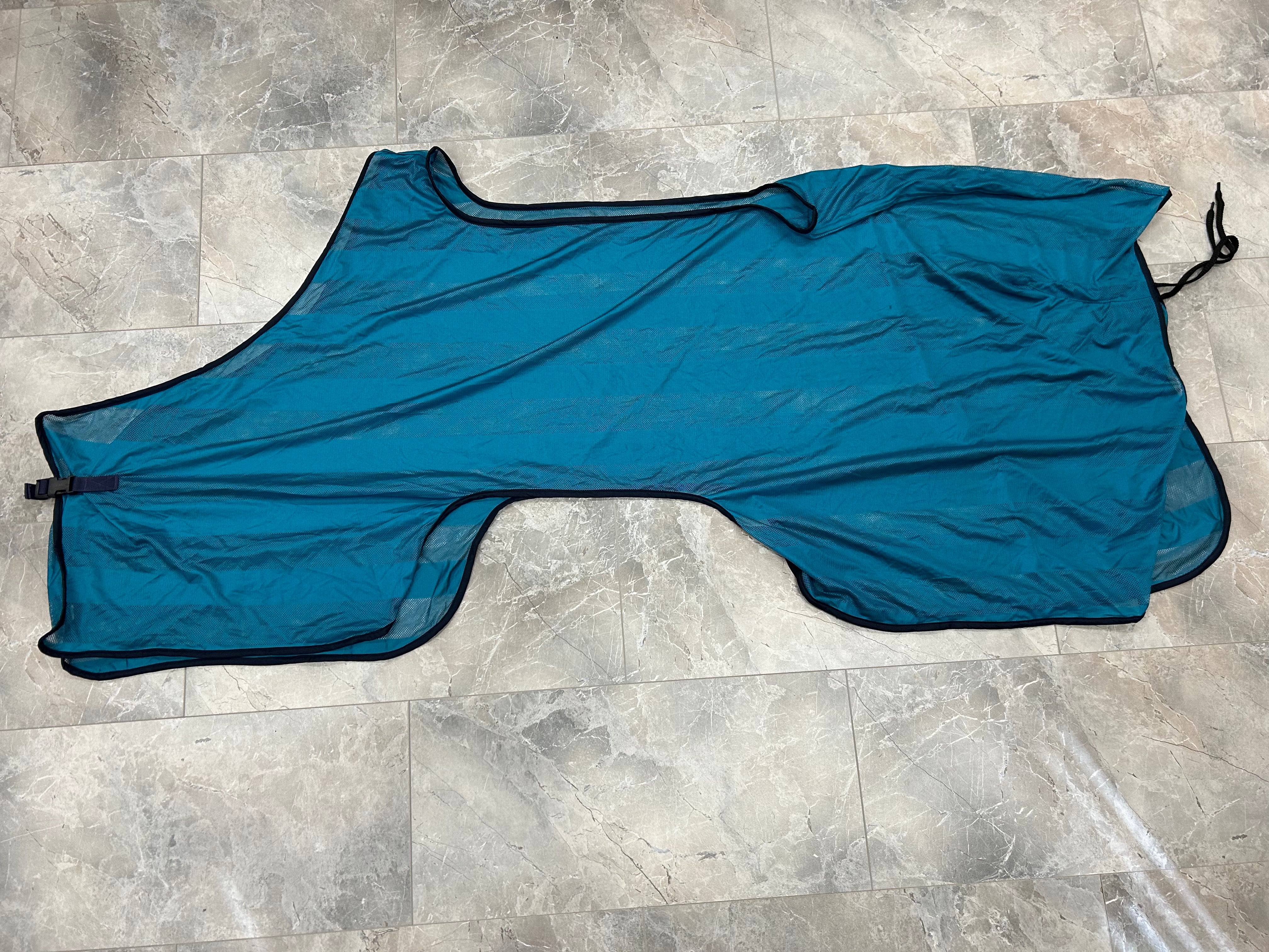 De deken is voorzien van een uitsparing voor het zadel, waardoor hij perfect over het zadel en onder de beugels past zonder te schuiven. Dankzij de stevige voorsluiting en staartriem blijft de deken goed op zijn plaats, ook tijdens beweging. Het lichte, ademende materiaal houdt vliegen, dazen en andere insecten op afstand, terwijl het je paard koel en comfortabel houdt tijdens buitenritten. Ideaal voor zomerse trainingssessies of ontspannen ritten in de natuur.