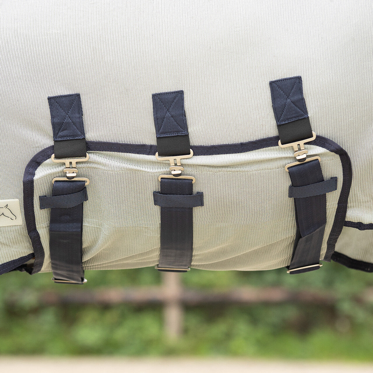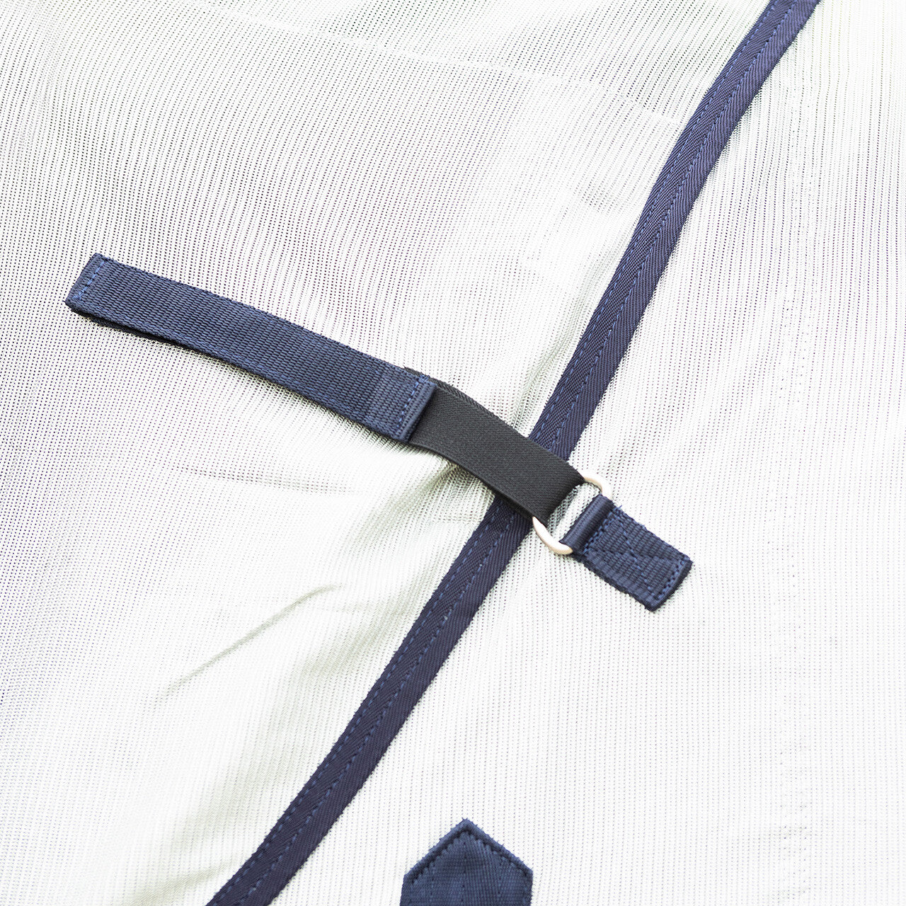 In de zomermaanden kunnen paarden veel last hebben van vliegen, dazen, muggen en andere vervelende insecten. Om je paard hier tegen te beschermen hebben wij diverse vliegendekens, zoals de vliegendeken met nek en hoed. Deze deken heeft een losse hals en hoed, waardoor je deze kunt afnemen als de muggen en insecten minder actief zijn. De deken heeft een buikflap die erg mooi aansluit en dubbel vast komt met klittenband en singels, hierdoor wordt verschuiving voorkomen.