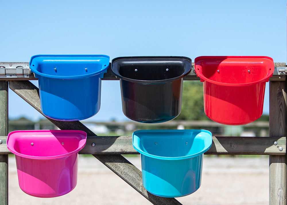 Kunststof voerbak met metalen beugels, makkelijk om mee te nemen of als uitneembak.