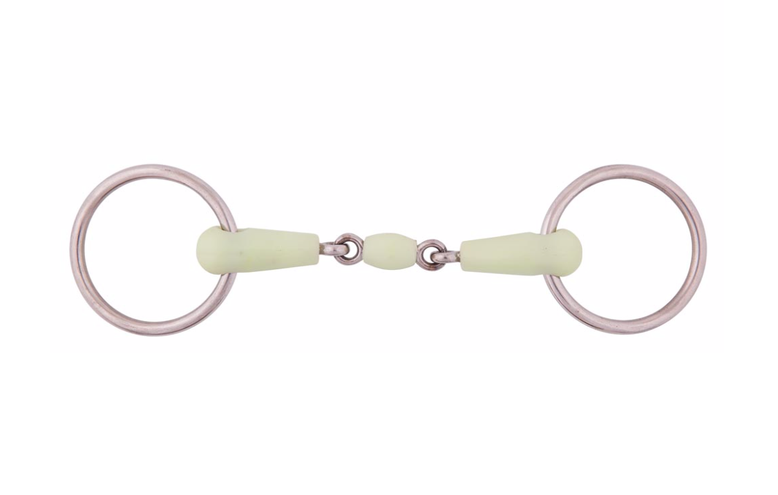 Dubbel gebroken watertrens met Apple Mouth mondstuk en roestvrijstalen ringen, ringen 55 mm bij 11.5 cm en 65 mm bij 12.5 cm, 13.5 cm en 14.5 cm. Het mondstuk heeft een dikte van 18 mm.