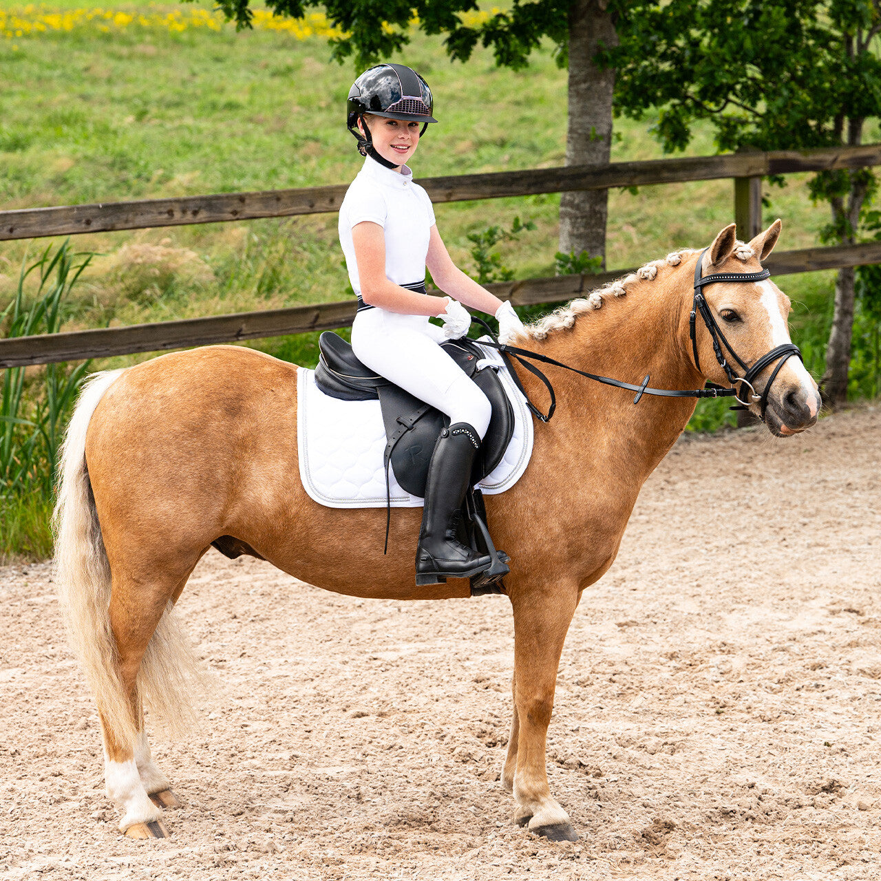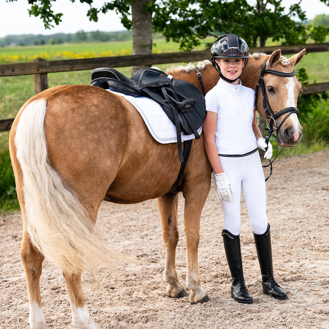 Sportief wedstrijdshirt welke gemaakt is van een soepele en gladde stof. Het shirt heeft een verborgen ritssluiting, met bovenaan een glinsterende drukknoop. De kraag is voorzien van een glitterrand.