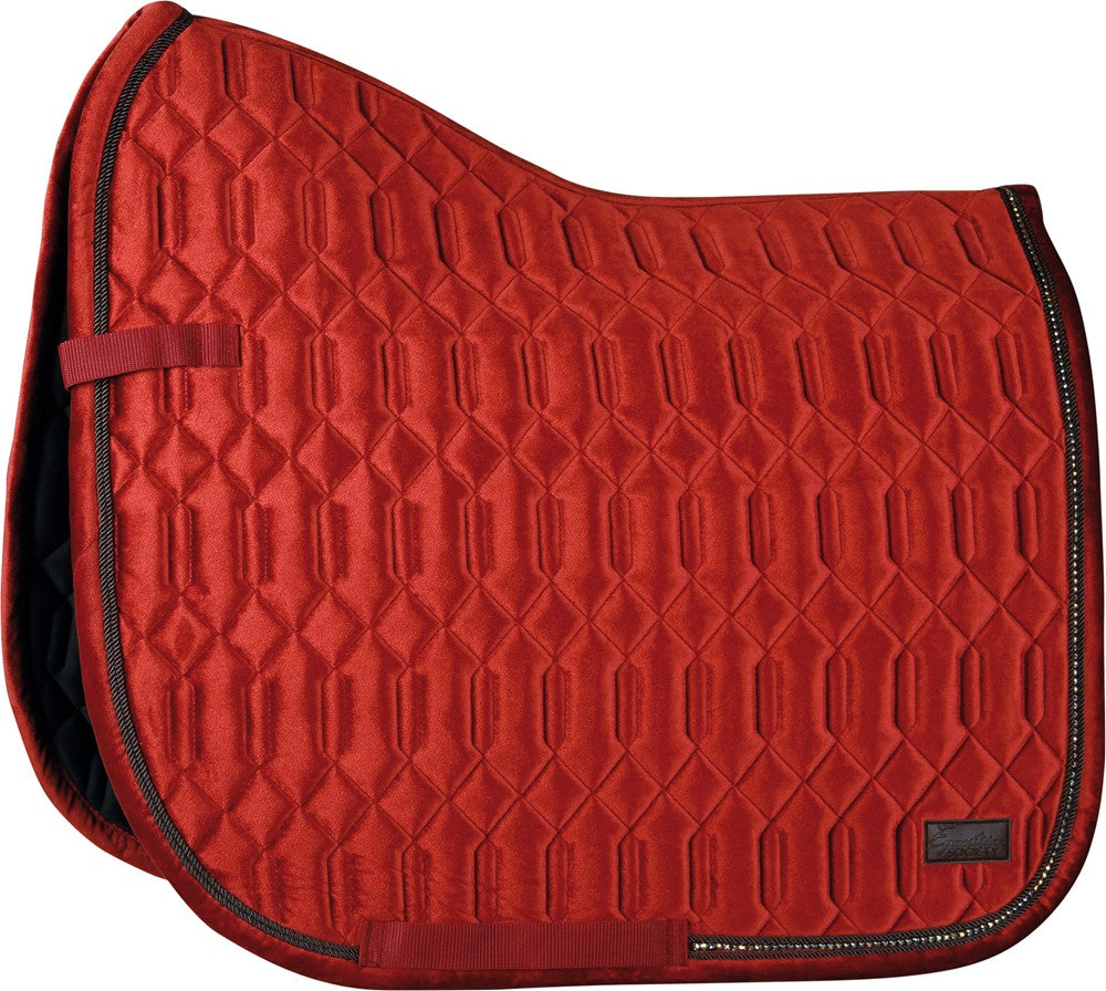 Zadeldek met dubbel smal sierkoord en aan de achterzijde kristallen, badge op de linkerzijde, lussen voor zadel en singel.