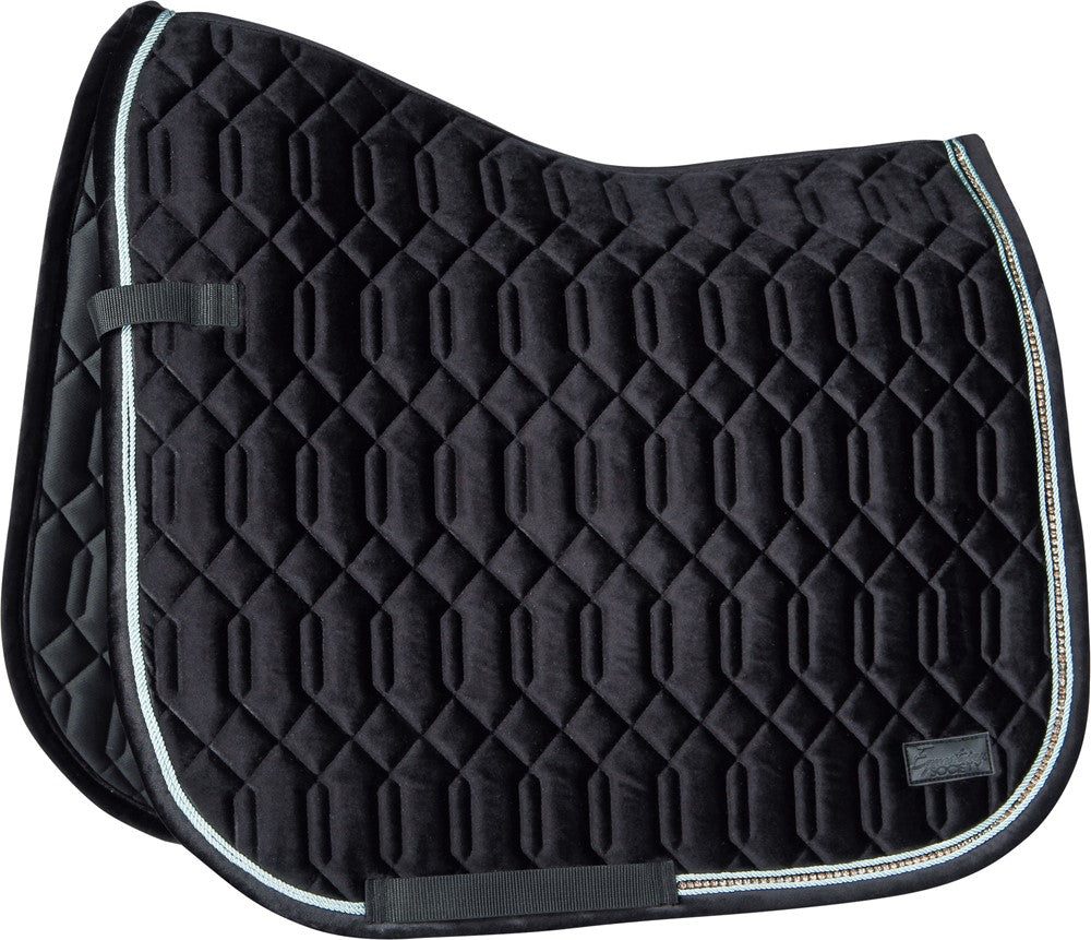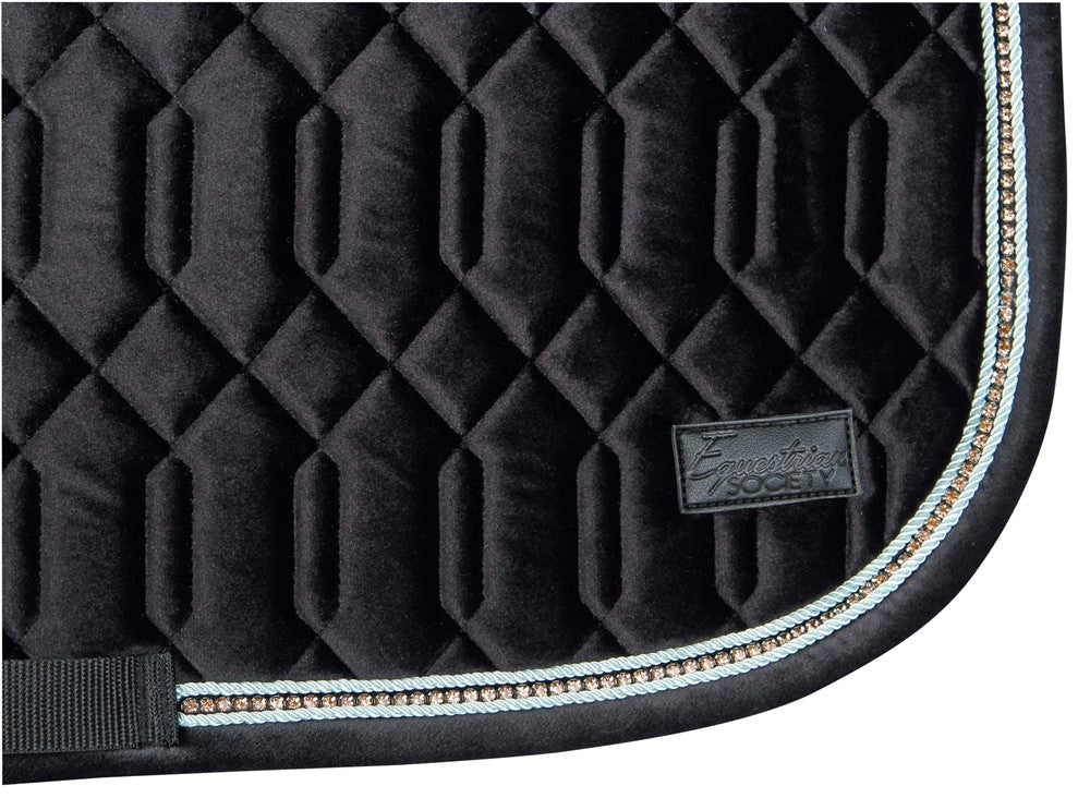 Zadeldek met dubbel smal sierkoord en aan de achterzijde kristallen, badge op de linkerzijde, lussen voor zadel en singel.